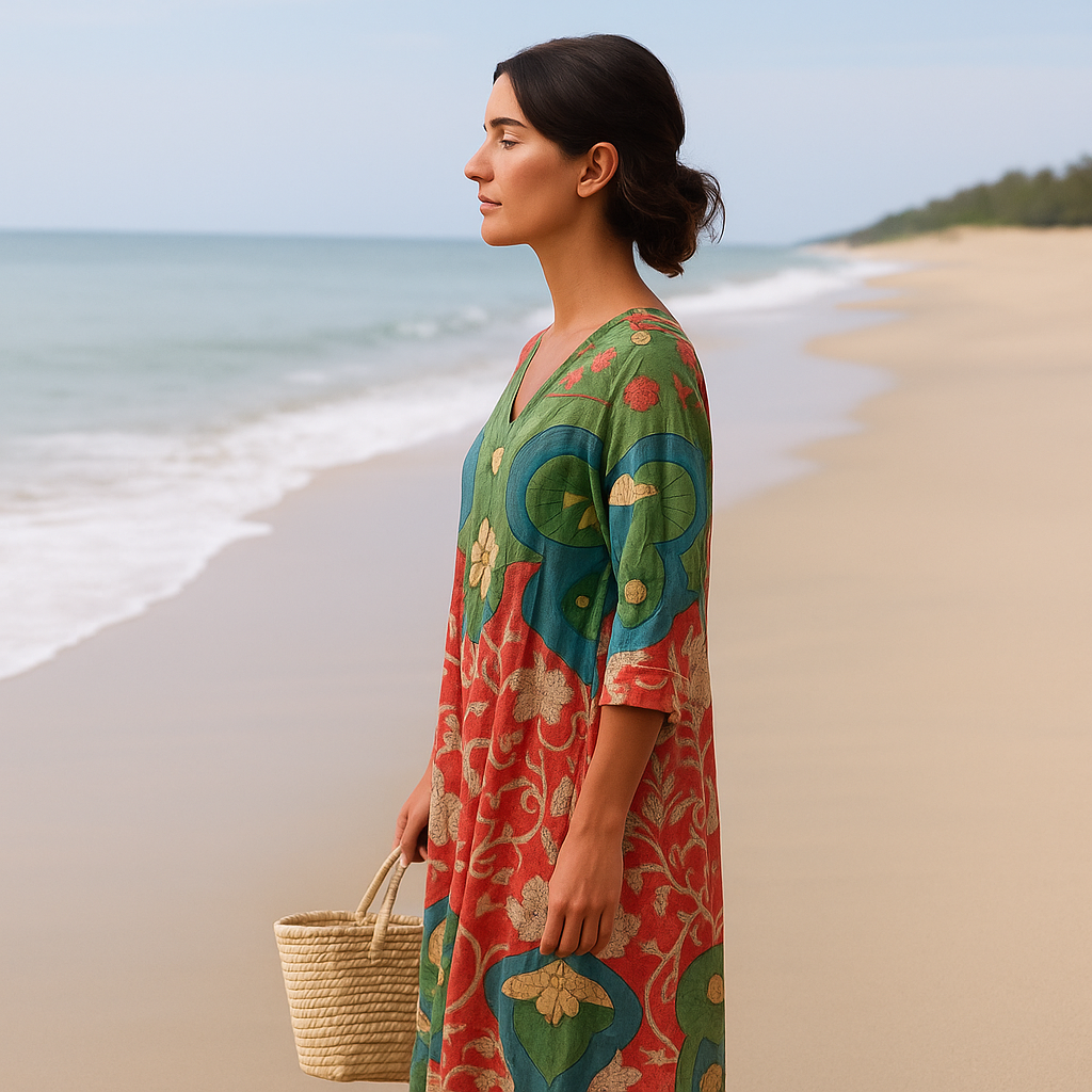 鮮やかな柄とゆったりとしたシルエットが調和したエレガントなカジュアルドレス。海辺の散歩にも日常のお出かけにも最適です。Vネックライン、七分袖、流れるようなスカートが、快適さと目を引く魅力を両立させます。